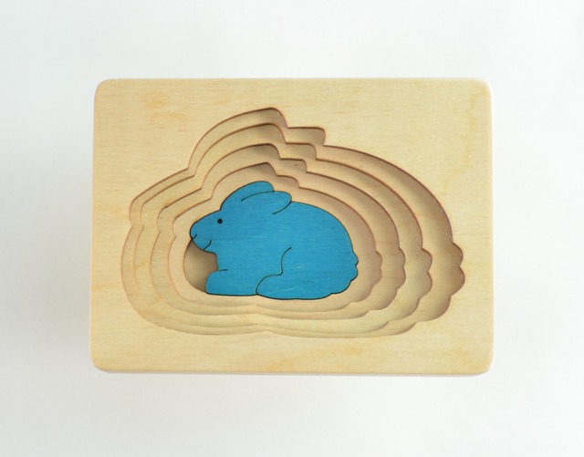 2重の木製パズル。 異なる上下2層の絵柄が1枚のボードにセットされたパズルです。 下になっている絵柄が、ちょこっと見えているのも、おもしろいですね♪ 対象年齢2歳ころ~