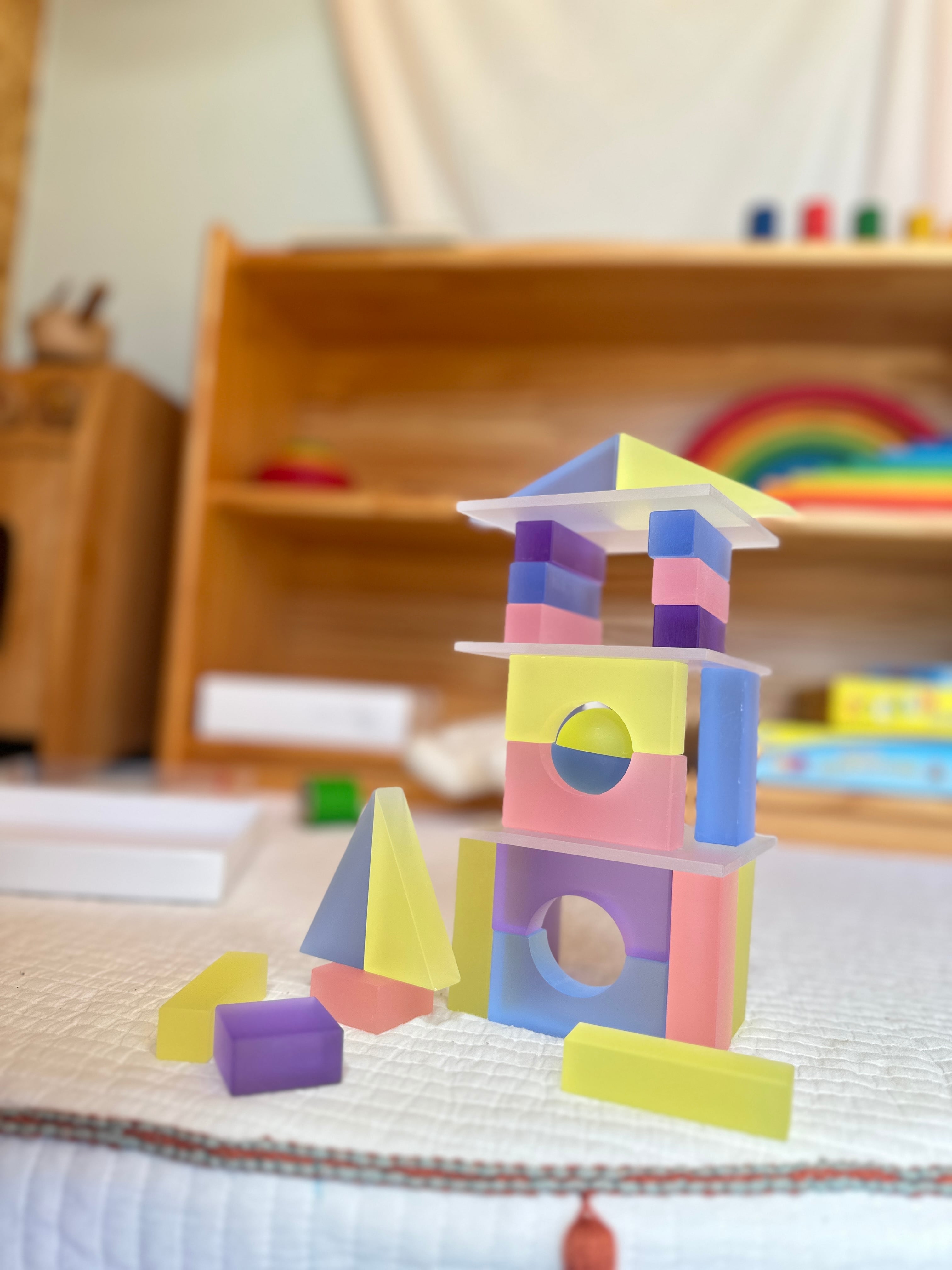 すべすべとした肌触りと、柔らかく光を通す美しい積み木は、お子様の心をすぐにとらえて離しません。