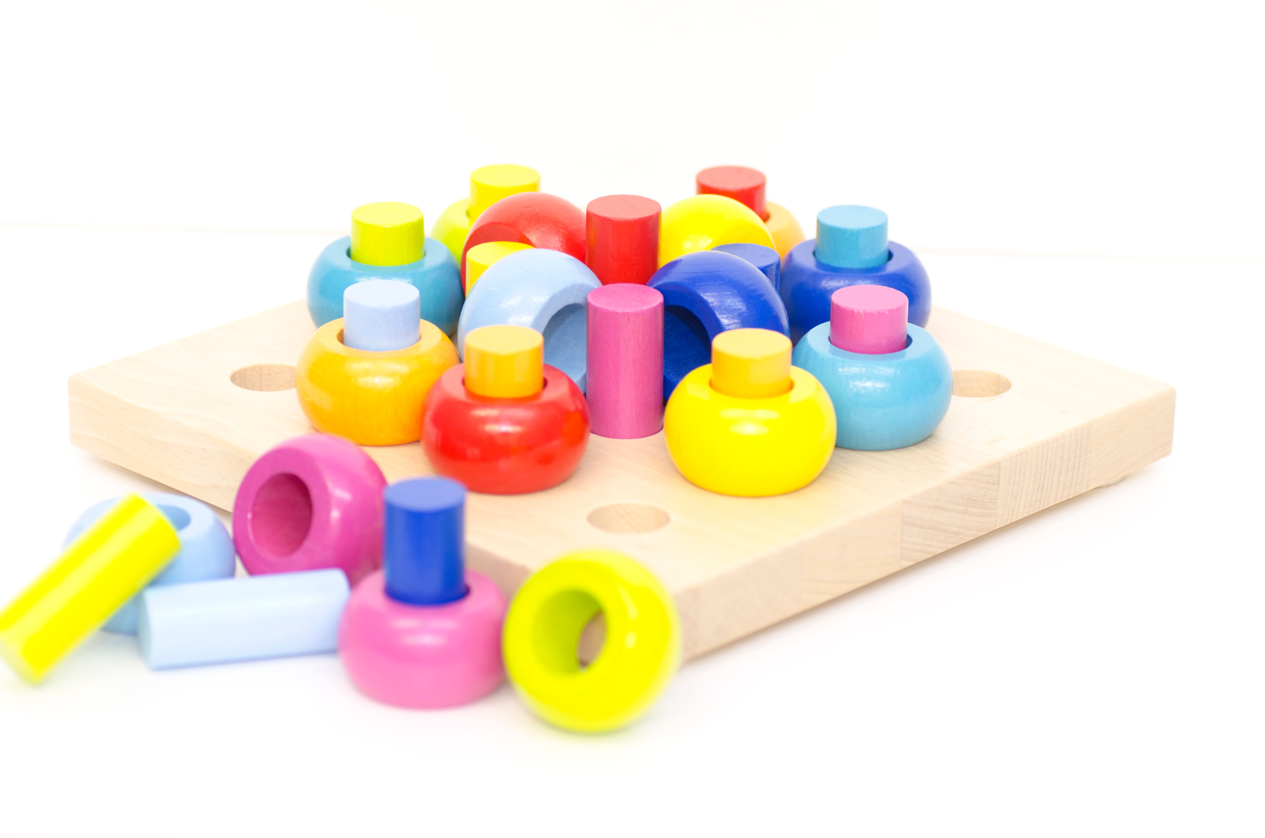 1歳過ぎからは、リングも使って積み重ねたり、2歳ころには色合わせや高いタワーづくりもできます。